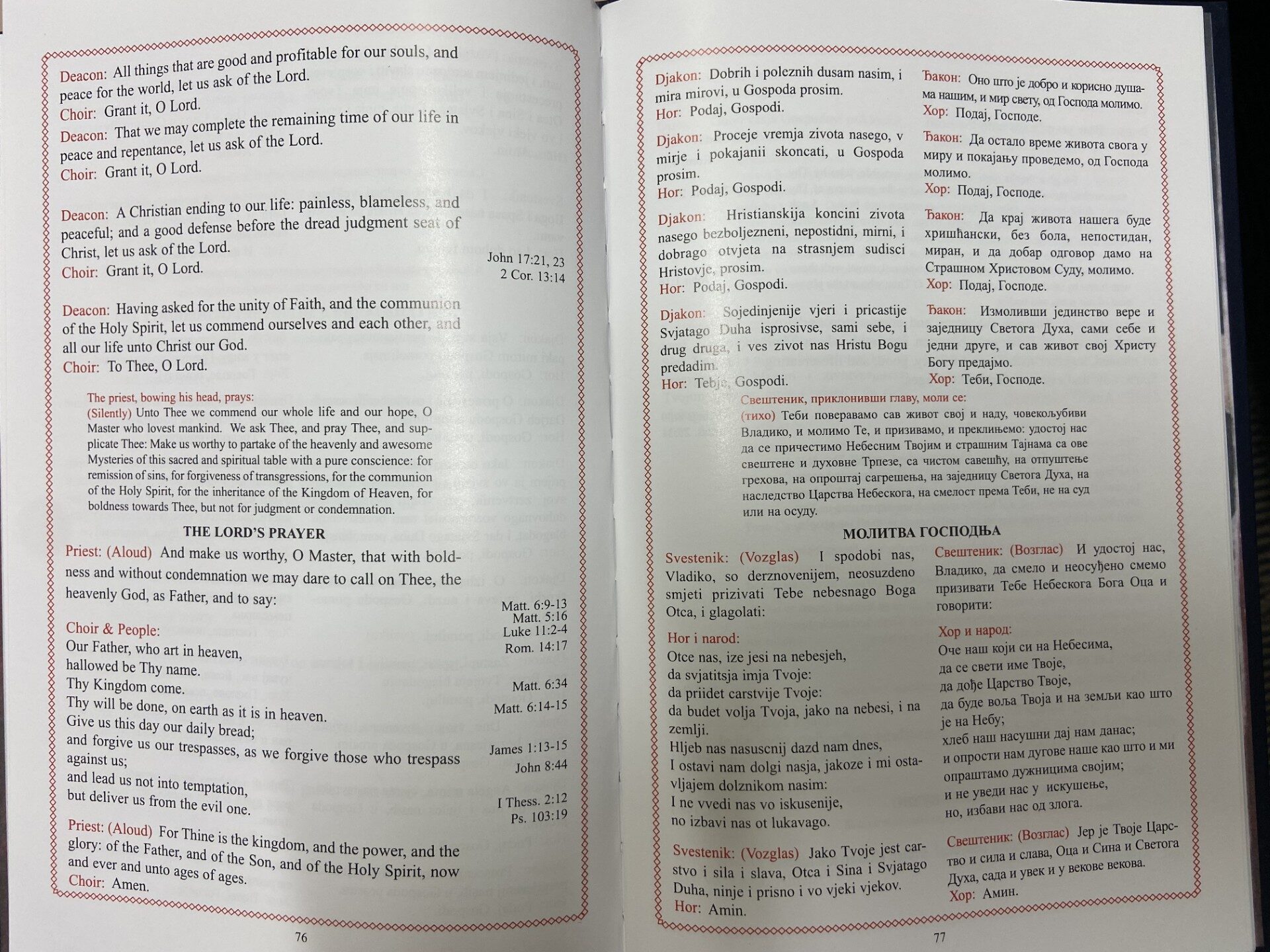 The design is composed of three languages (English, Church Slavonic, and Serbian) displayed in a parallel format and accompanied by scriptural references.