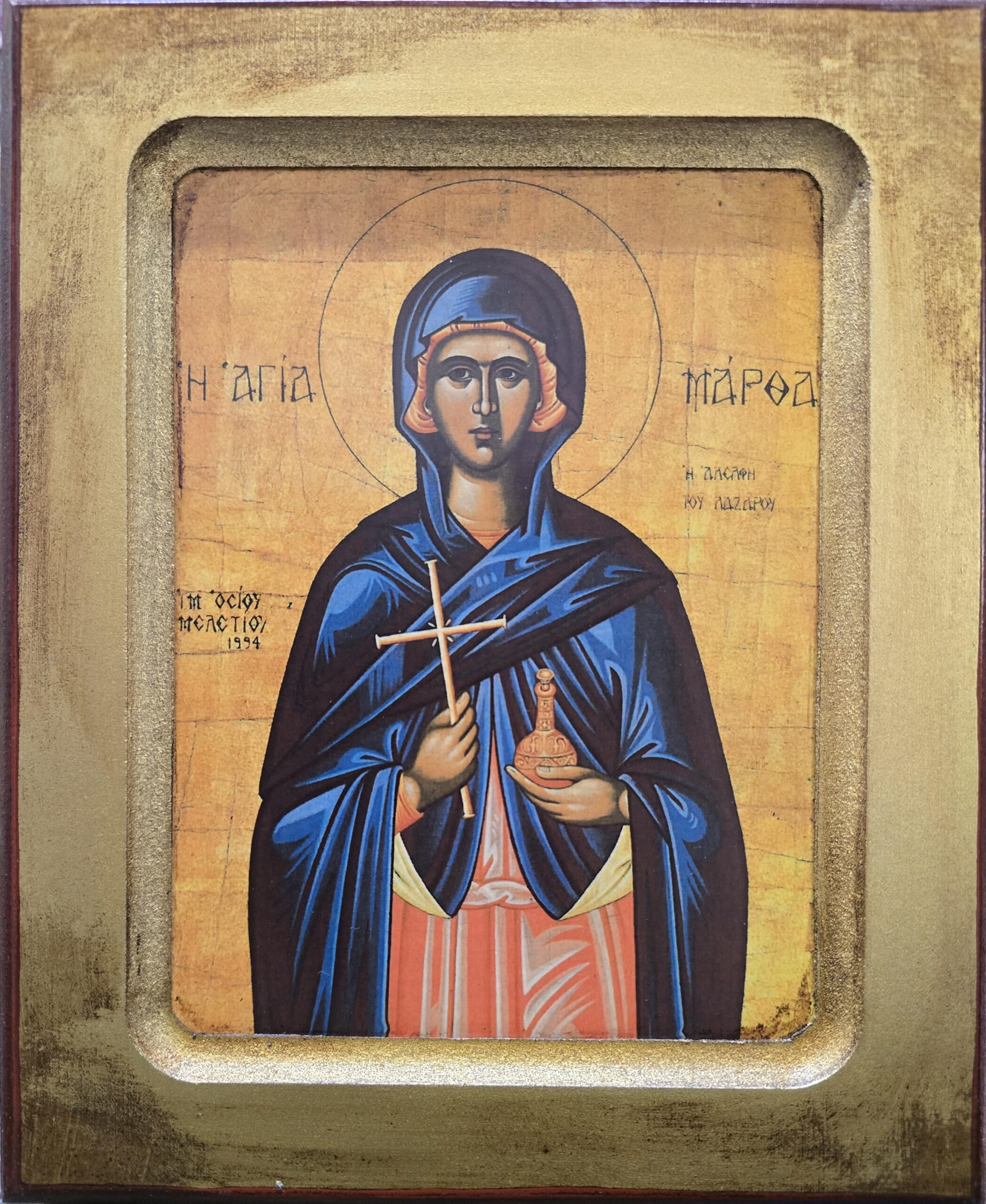Sister of Lazarus and Mary. She is also celebrated collectively as one of the Myrrh-bearing Women on the Sunday of the Myrrh-bearers and appears in the commemoration of Lazarus Saturday.